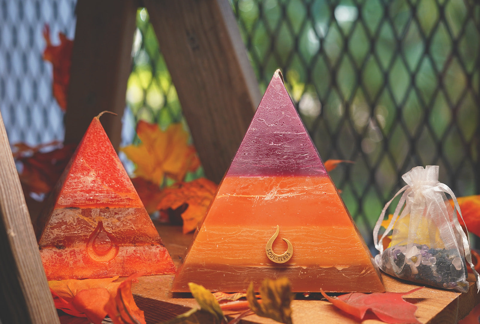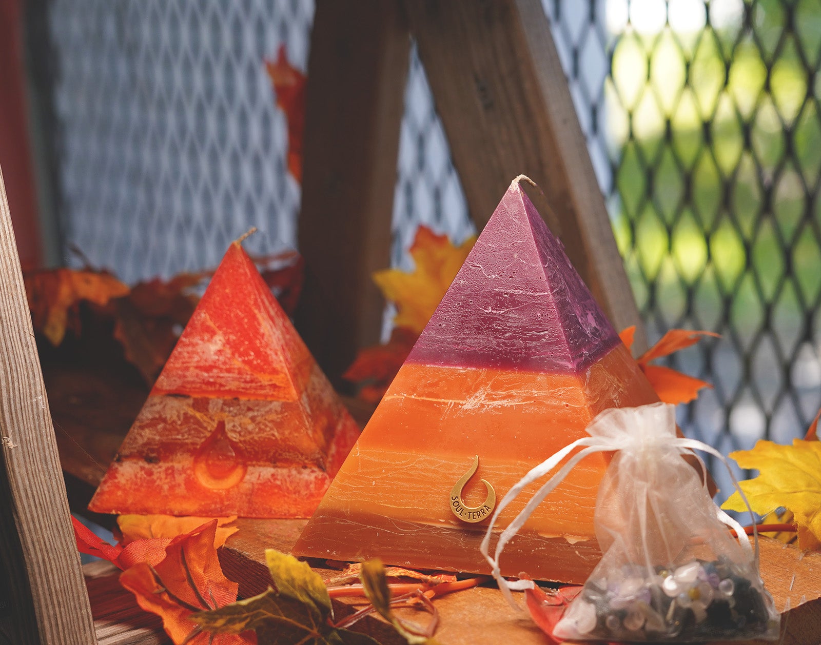 Elevate your ambiance with our signature special edition crystal pyramid candle: a vibrant fall-infused masterpiece that delights the senses with an enchanting cinnamon scent. Its warm hues echo the transition of seasons, inviting you to celebrate the beauty of change and abundance.